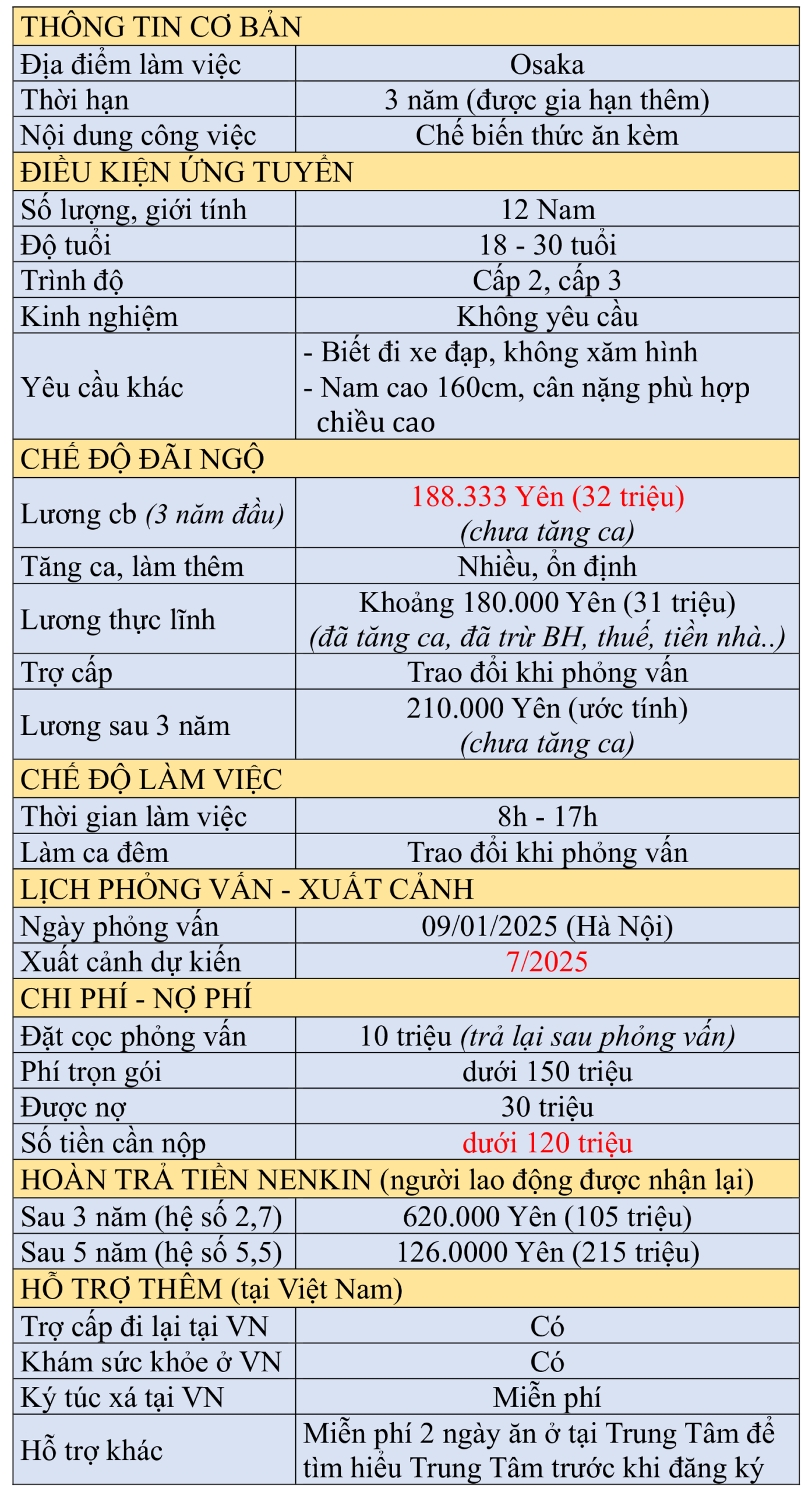Nam 18-30 tuổi. Cốt thép ở Tokyo( bao đỗ). Lương CB Năm 1 (18,5man-31triệu), Năm 2 (21,5man-36 triệu), Năm 3 (23,5man-40 triệu)