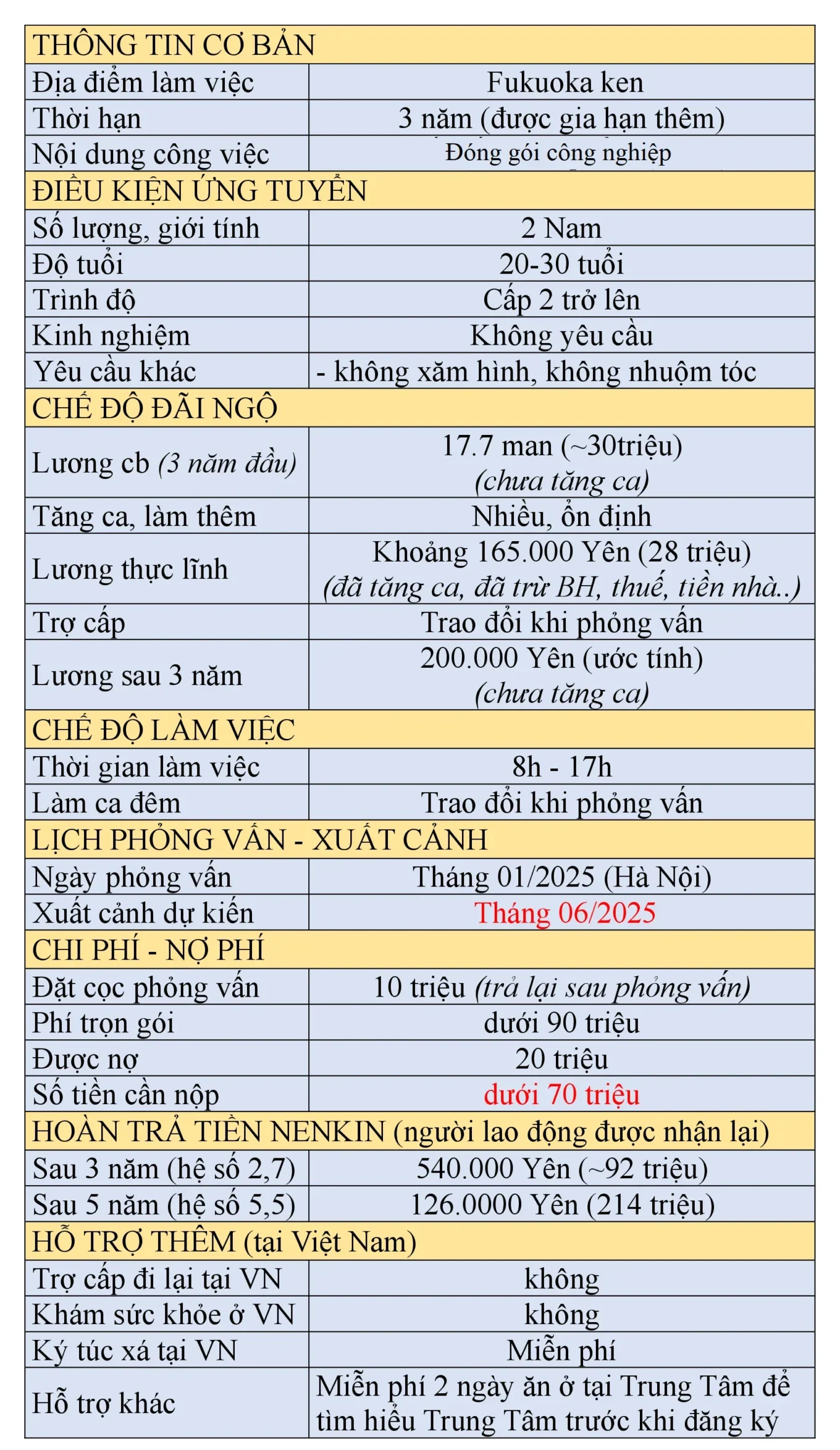 Tuyển Nam 20-30 Tuổi làm đóng gói công nghiệptại Fukuoka